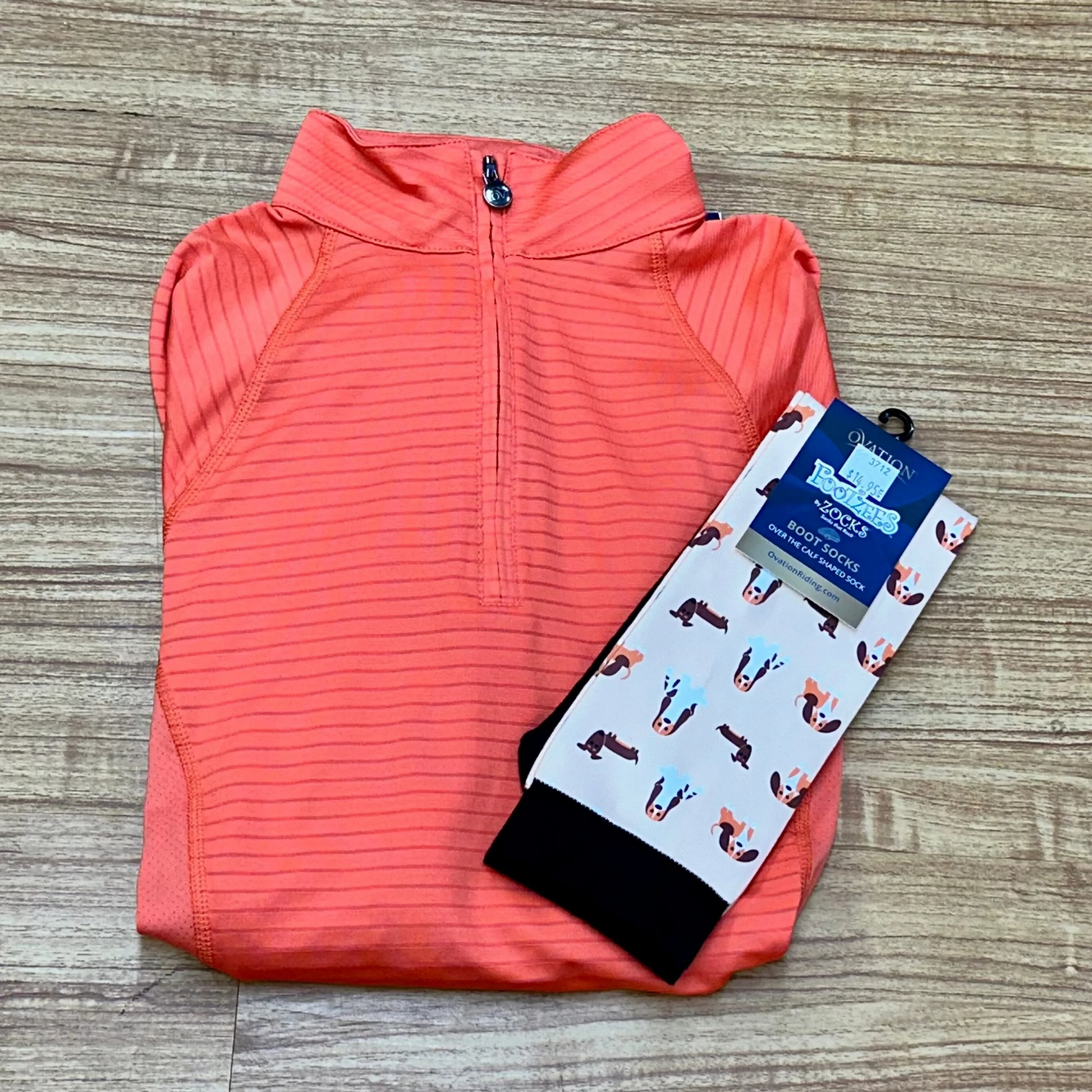 Stay stylish and comfortable in and out of the saddle with our OVATION Riding Bundle – Ladies Sunshirt & Zocks . This curated set includes the Ovation Ladies ¼ Zip Long Sleeve Sunshirt and a pair of Ovation Zocks™, making it the perfect gift for any rider.